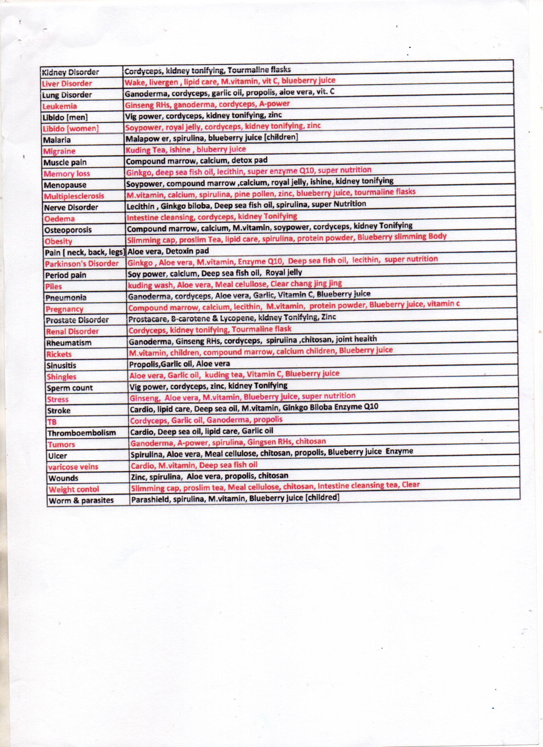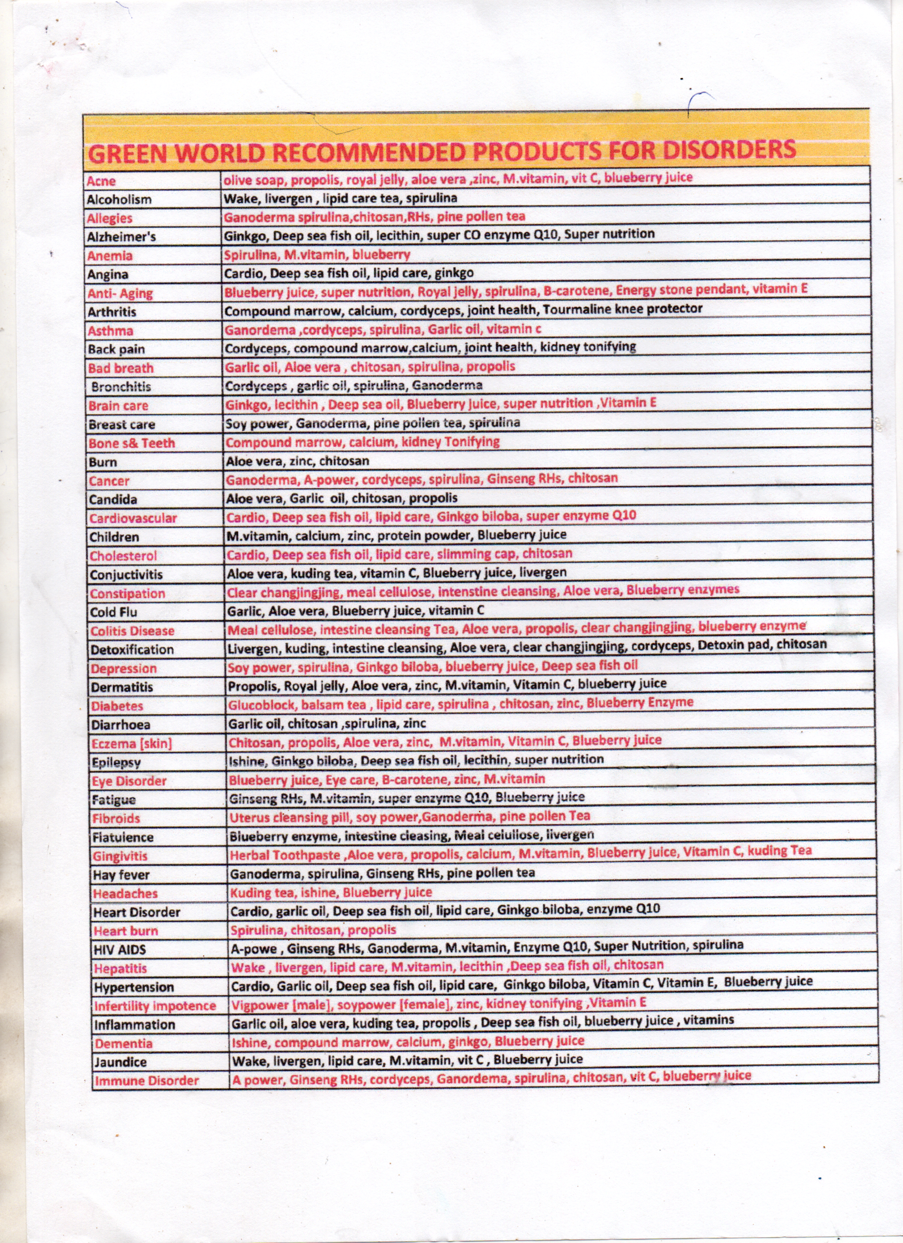 Green World Recommended Products For Disorders